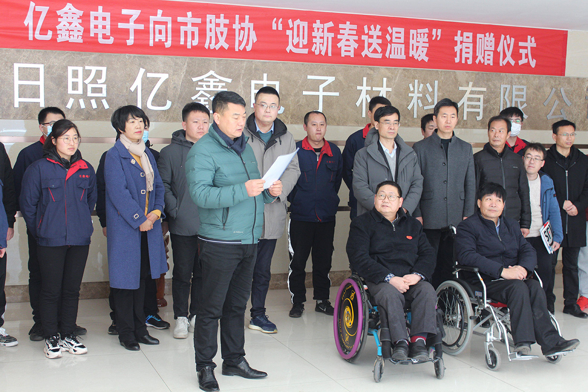 今天,我們億鑫電子向市肢殘人協(xié)會“迎新春、送溫暖”捐贈儀式,在這里隆重舉行。我謹代表億鑫電子向各位領(lǐng)導(dǎo)、各位來賓致以熱烈歡迎和衷心感謝!向全市殘疾人朋友致以真誠的問候和良好的祝愿! 我們億鑫電子成立于2010年8月,占地面積4.1萬平米,建筑面積3.8萬平米,員工180余人,投資總額2.8億元。是集研發(fā)、生產(chǎn)、銷售于一體的國家級高新技術(shù)企業(yè)。公司產(chǎn)品磁性材料屬國家重點支持的高新技術(shù)領(lǐng)域中新材料領(lǐng)域,符合國家的產(chǎn)業(yè)政策,是半導(dǎo)體行業(yè)重要基礎(chǔ)性材料,廣泛應(yīng)用于家電、5G網(wǎng)絡(luò)、新能源汽車、光伏太陽能、無線充電等行業(yè),并在軍工產(chǎn)品及航空航天領(lǐng)域得到廣泛應(yīng)用。其中高導(dǎo)磁性材料、功率磁性材料國內(nèi)市場占有率穩(wěn)居國內(nèi)磁性材料行業(yè)領(lǐng)先地位。公司被省科技廳等部委認定為高新技術(shù)企業(yè),山東省級企業(yè)技術(shù)中心,山東省一企一技術(shù)研發(fā)中心,山東省工程實驗室,日照市企業(yè)技術(shù)中心,日照市軟磁鐵氧體工程實驗室,日照市磁性材料研究中心。